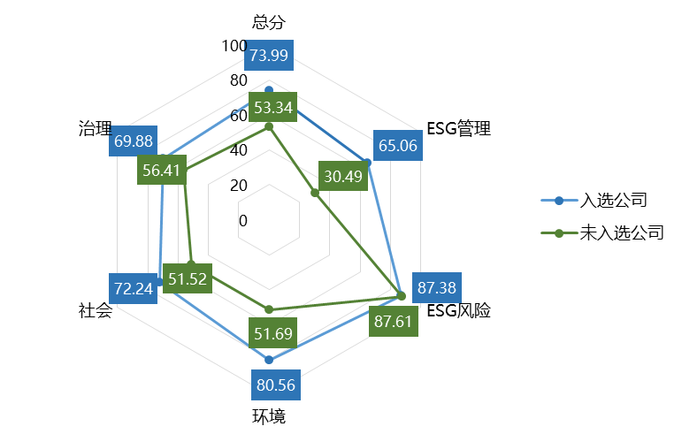 本次报告从商道融绿ESG评级A-以上的A股上市企业范围中,基于优中选优的原则,按各行业中排名前10且近三年无重大ESG风险事件的条件,最终有138家入选,入选数量占A股总数的2.6%,市值占比19.7%。下图对比了入选和未入选企业的平均ESG表现,入选企业ESG平均得分为73.99分,较未入选企业高出20.05分。E/S/G三个维度中,入选企业均体现了显著的领先优势,其中环境维度更为突出,平均分高于未入选企业28.87分。